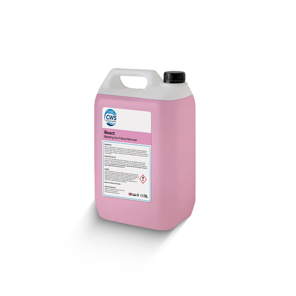 1 x 5L React - Bleeding Fallout Remover, a super effective solution for dealing with industrial fallout and brake dust contamination. Turns red on activation making it easy to rinse contamination away.